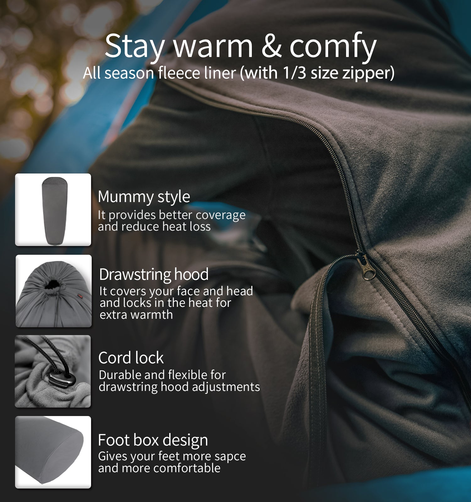 - MADE WITH COMFORT IN MIND: This mummy sleeping bag is made using soft yet flexible fleece fabric that keeps you warm while giving you the freedom to move around. Thanks to the drawstring hood it locks in the heat for extra warmth while the foot box design gives your feet more space to move around