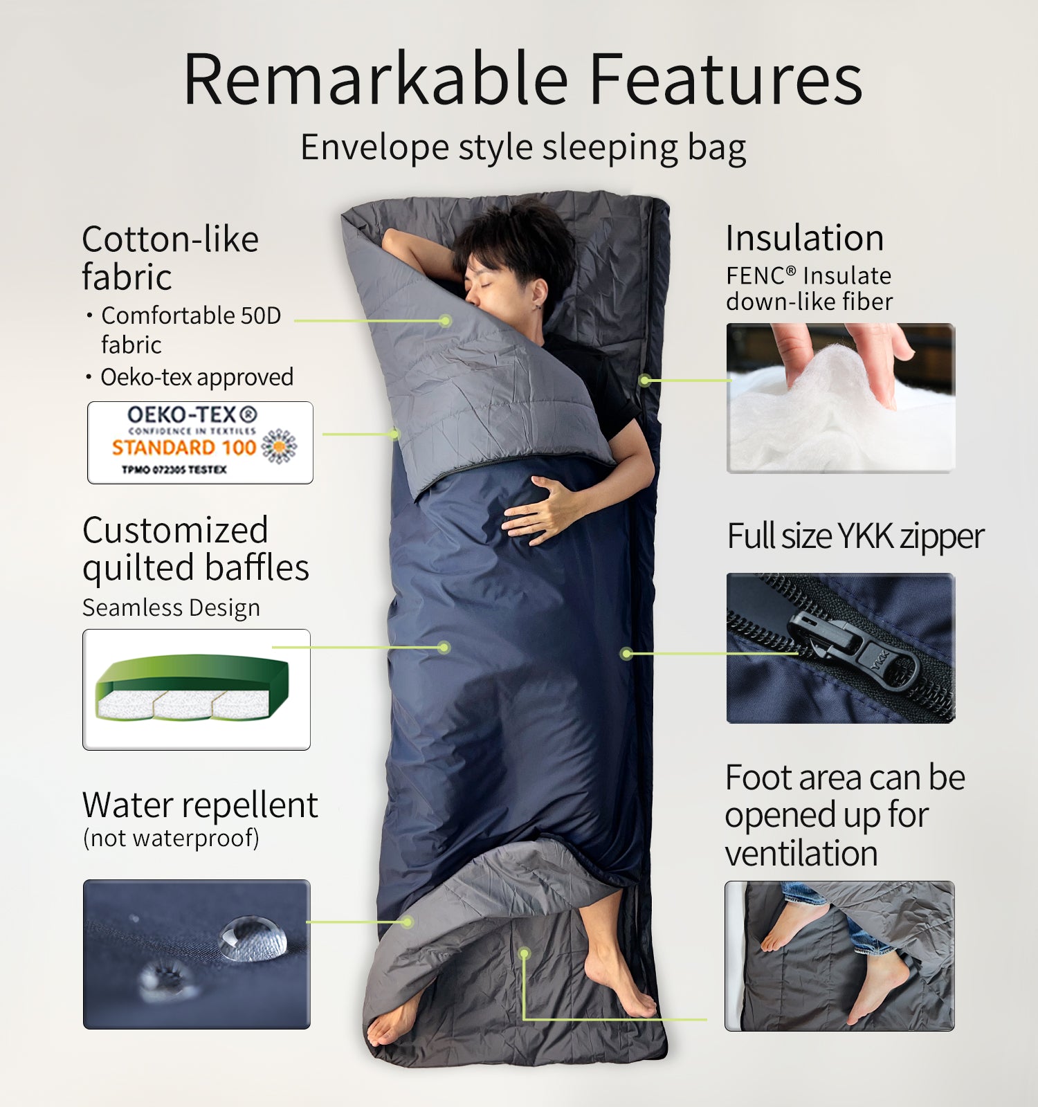 - FENC Insulate and Easy to Clean: This sleeping bag features FENC Insulate material, offering superior advantages over synthetic down fibers. With enhanced elasticity, higher fill power, improved warmth retention, and down-like compressibility, it provides exceptional performance. Plus, it is easily maintained as it is machine washable, ensuring convenient and hassle-free cleaning.